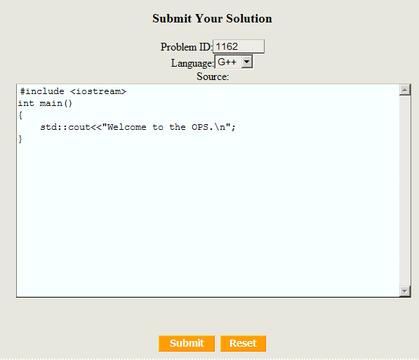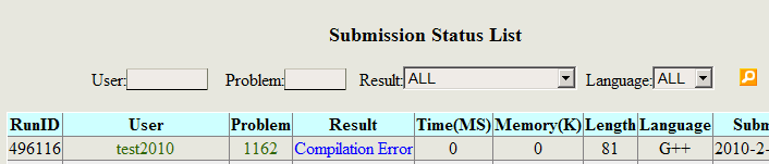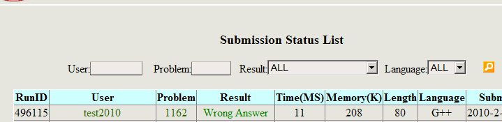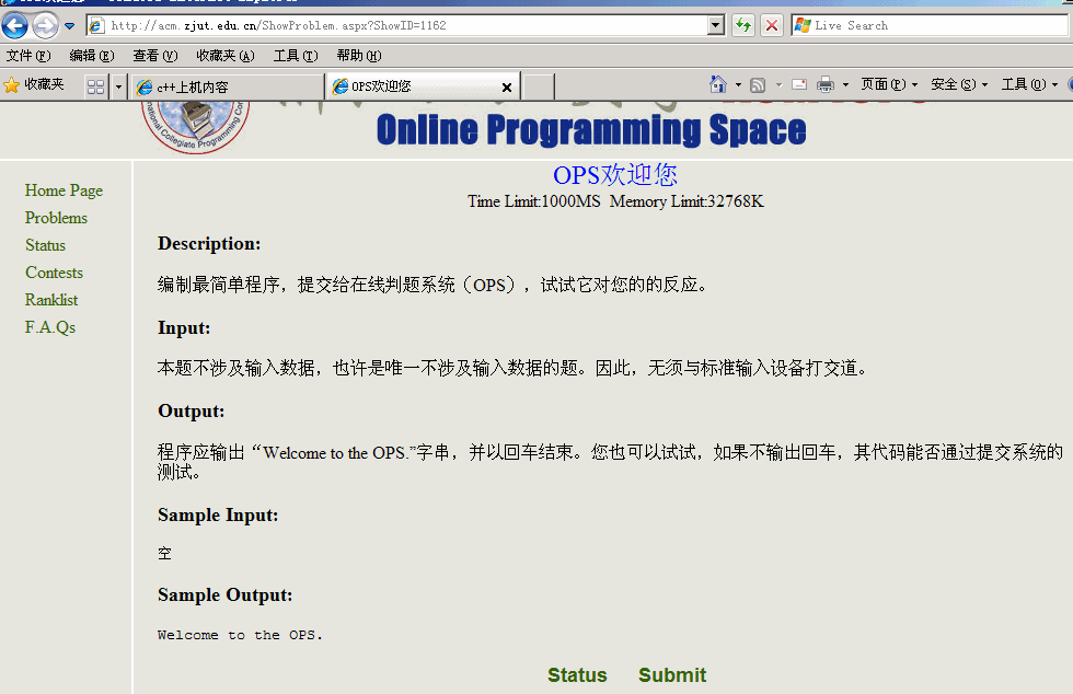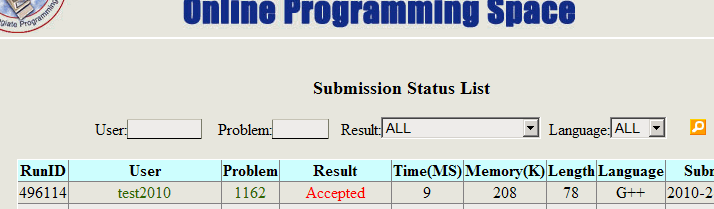 Status是提交情况,越在前面的页面在时间上越是靠近现在,反映用户做大库题目时的提交状态,做哪个题、AC抑或什么错、运行时间、占用空间、用什么编译器以及提交时间,籍此可以断定自己提交的大致问题所在。提交时请选择G++编译器。
